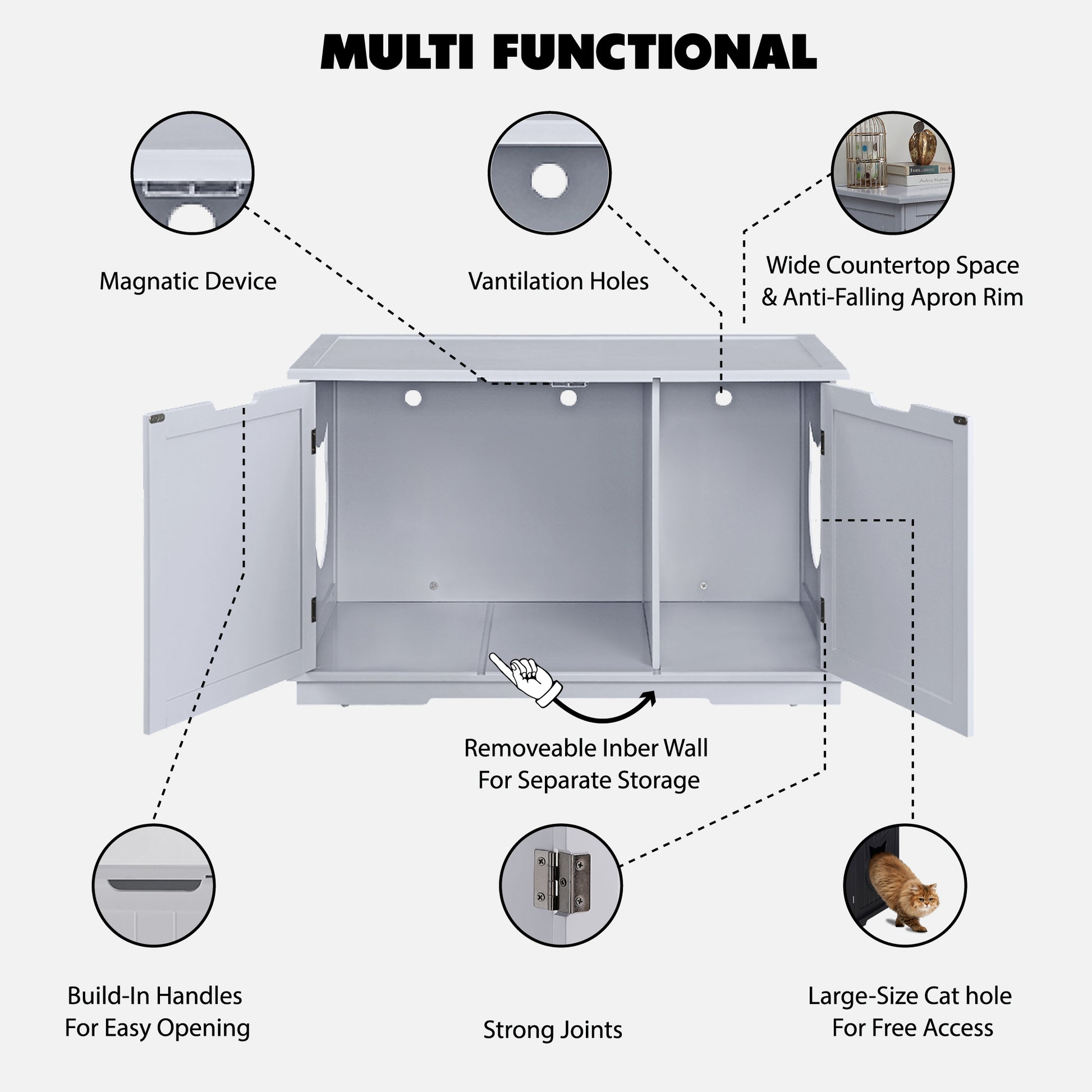 - Litter boxes of various sizes (extra-large, jumbo size, automated) can be placed.